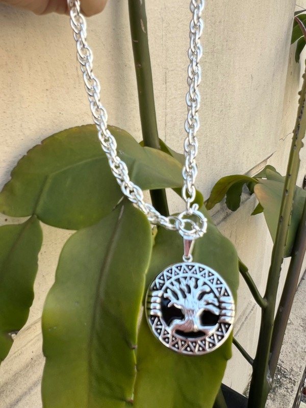 Medallón árbol de la vida con cadena larga turbillon acero blanco