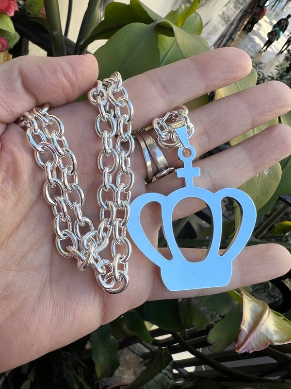 Medallón corona con cadena larga acero blanco